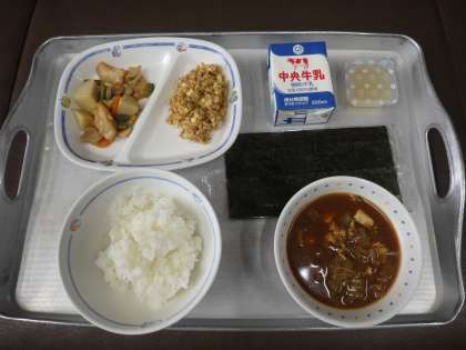 さて、今日の給食は、豊田市産の米、豆腐、油揚げ、しいたけ、はくさい、さといも、だいこん、にんじん、納豆、なしが使われています。