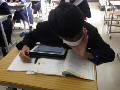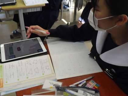 中間テストが目前のため、単元の復習も兼ねて演習問題に取り組んでいました。一人で、あるいは仲間や教科担任と、さらにはタブレットから入手できる解説を活用して、自分の力になるように努力していました。