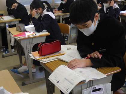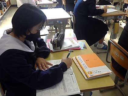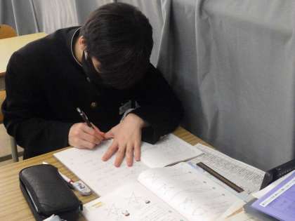 中間テストが目前のため、単元の復習も兼ねて演習問題に取り組んでいました。一人で、あるいは仲間や教科担任と、さらにはタブレットから入手できる解説を活用して、自分の力になるように努力していました。