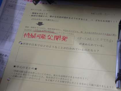 先回の授業の続きで、南アメリカ州で問題になっている地球的な課題について考えていました。「持続可能な社会」の実現のために、環境を守りつつも経済を発展させる各国の取り組みについて、各自で調べ始めていました。