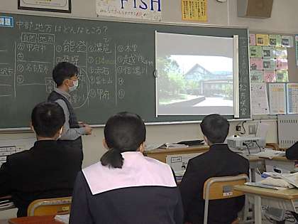 地理分野の学習で、中部地方学習に入っていました。まずはこの地方でよく耳にするキーワードを上げていきます。これからの学習への興味を引き出す工夫がなされていました。