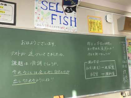 2年生の教室の黒板には、担任からのメッセージが書かれていました。