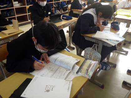 中間テストに向けてのテスト勉強でした。これまでに学習した教科書やテキストの問題に再チャレンジです。また、テキストの解説をじっくりと読み込んで理解を深めようとしている生徒もいました。