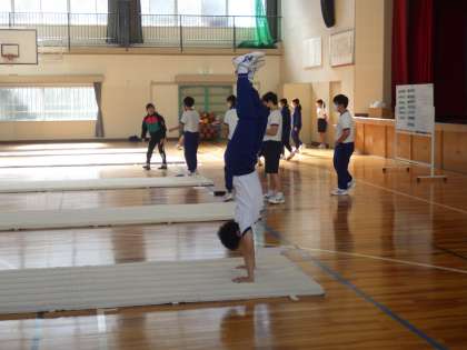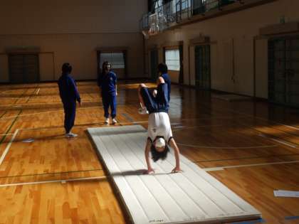 倒立からの発展で、倒立前転、側転、腕立て前方回転(ハンドスプリング)、ロンダートにも挑戦していました。