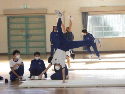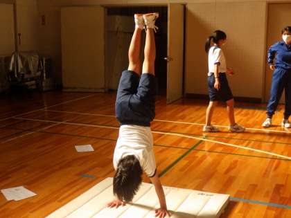 倒立からの発展で、倒立前転、側転、腕立て前方回転(ハンドスプリング)、ロンダートにも挑戦していました。