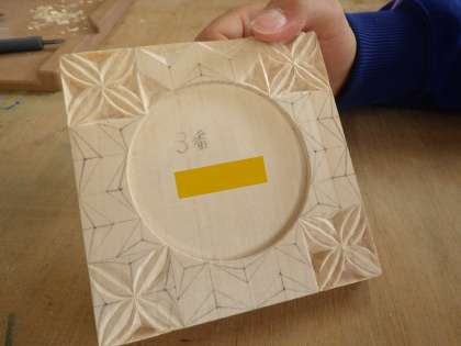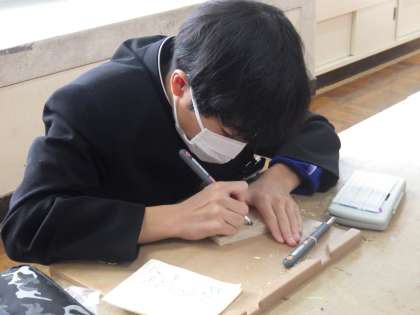 木彫の学習で、幾何模様を施したコースターづくりが行われていました。少しずつ完成に近づく自分の作品を見て、つい「先生、ここうまくない?」と得意気に作品を見せてくれます。