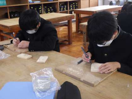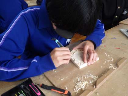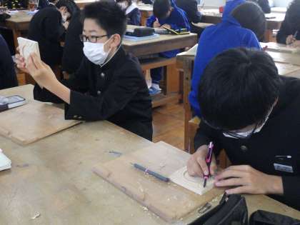 木彫の学習で、幾何模様を施したコースターづくりが行われていました。少しずつ完成に近づく自分の作品を見て、つい「先生、ここうまくない?」と得意気に作品を見せてくれます。