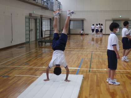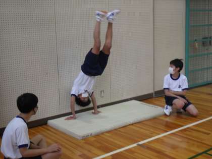 いたるところにマットが設置され、倒立の練習に励んでいます。仲間や壁に協力してもらい、できるだけきれいな倒立の完成を目指しています。すでにできている生徒は、倒立前転にも挑戦していました。