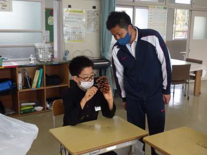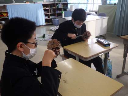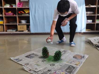 前回に引き続き、大きな松ぼっくりを使ってのクリスマスツリーづくりです。冬休み直前に予定されている小学校の児童との交流会に向けての準備です。とげを丁寧に取り除き、その後スプレーで色を付けていきます。
