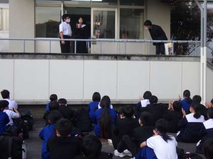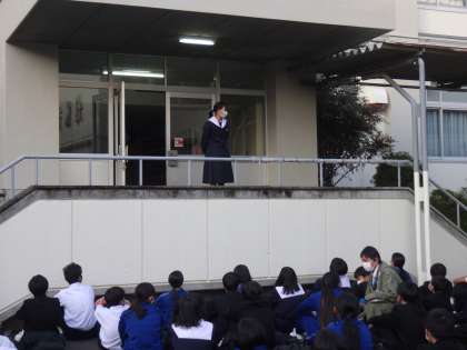 交通安全の担当の先生より、再度、登下校の注意が呼びかけられました。生徒も協力してくれ、楽しい雰囲気で意識すべきことを確認していました。