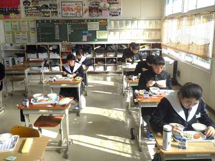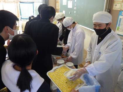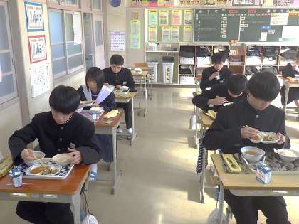 テスト後の栄養補給も大切です。配膳時の笑顔とは反対に、黙々と給食をほおばる3年生。今日のテストの振り返りでもしているのでしょうか? それとも、2日目のテストのことを考えているのでしょうか?
