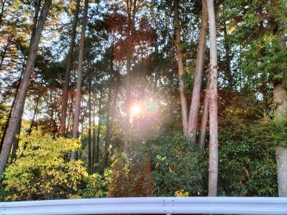 テスト初日の日程を終えた生徒たちが下校した後、あいさつの坂道から西の方角を見ると、雑木林越しに太陽の光がこぼれてきました。