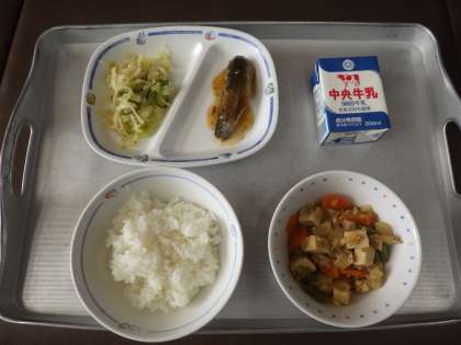 今日の献立は、みそ煮込みおでん、アーモンドあえ、わかさぎのから揚げ、ごはん、牛乳 でした。 エネルギー:825kcal