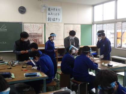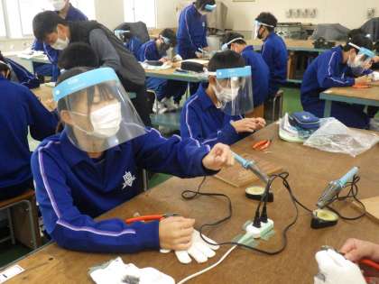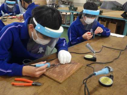はんだごての技術を向上させるために、簡単な作品づくりに取り組んでいました。試行錯誤や作業の反復を行っています。出来上がった作品を見せ合ったり、作業の手順についてアドバイスをもらったりして活動していました。