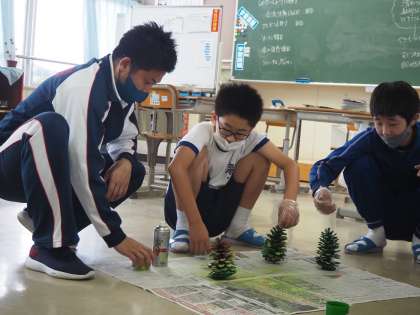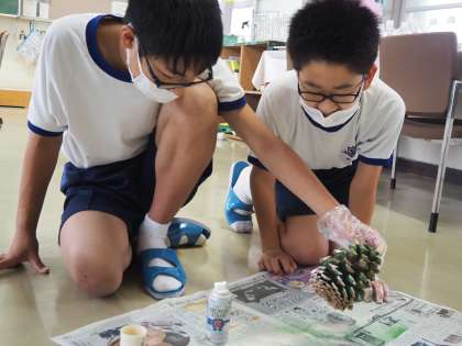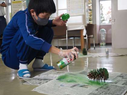 小中交流会に向けて、大きな松ぼっくりを使ってのクリスマスツリーづくり。小学生の喜ぶ顔を想像しながら、仲間と協力した作業が行われていました。