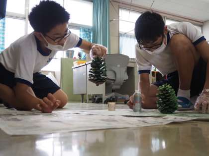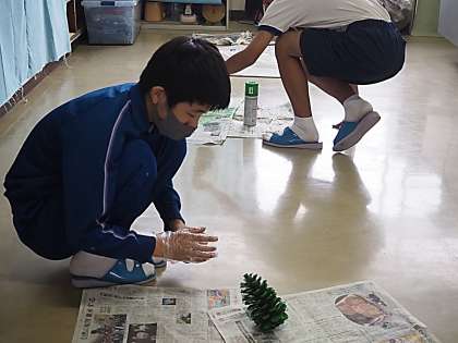 小中交流会に向けて、大きな松ぼっくりを使ってのクリスマスツリーづくり。小学生の喜ぶ顔を想像しながら、仲間と協力した作業が行われていました。