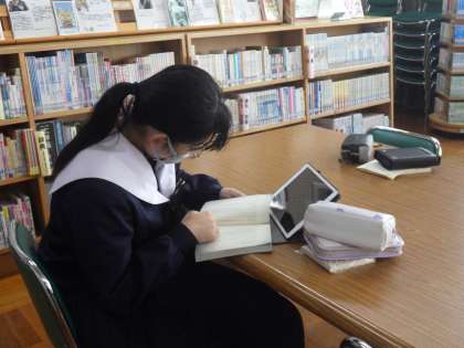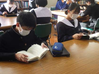 後期中間テストも終わり、また祝日明けの今日も、落ち着いた様子で一日がスタートしました。写真は、朝の読書を図書館で行った2年生の様子です。