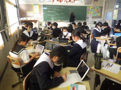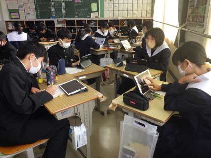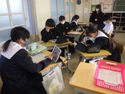 「持続可能な住生活」の単元の学習です。今日の課題は「環境や人に配慮した住まいを考える」でした。自分で調べたことを仲間と共有しながら、レポートを作成していきます。仲間の発想に興味を示しつつ、内容の濃いレポートづくりに取り組んでいました。
