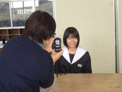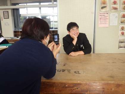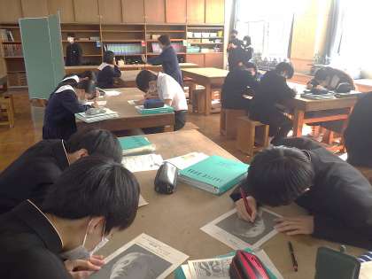 「明暗分割」という技法を使って今後作品づくりを進めるにあたって、今日はそのトレーニングが行われていました。また、モデルとなる自分自身の笑顔を教科担任に撮影してもらっていました。