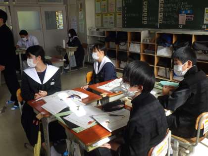 「言葉の向こうに」という資料を使って、コミュニケーションの望ましい在り方について考えていました。SNSの中傷コメントに対して自分ならどうするかを話し合ったり、SNSで言葉がエスカレートしたり、中傷が起きたりする原因を探っていました。