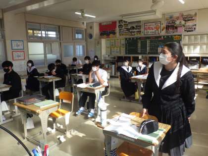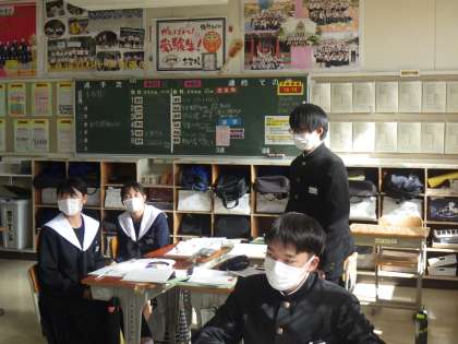 「言葉の向こうに」という資料を使って、コミュニケーションの望ましい在り方について考えていました。SNSの中傷コメントに対して自分ならどうするかを話し合ったり、SNSで言葉がエスカレートしたり、中傷が起きたりする原因を探っていました。