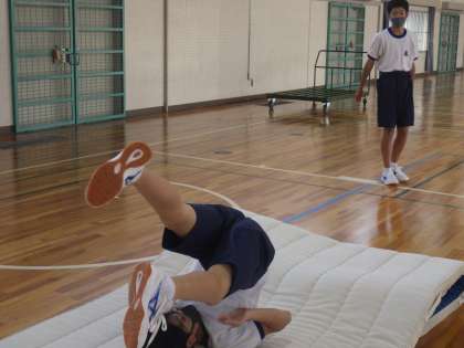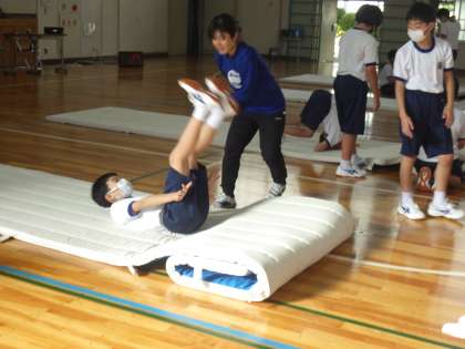 今日は、側転、伸膝後転にチャレンジしていました。ポイントを確認したあと、一斉に練習が始まります。マットを織り込んで段差や傾斜をつくるなどの工夫をして、一生懸命練習に励んでいました。