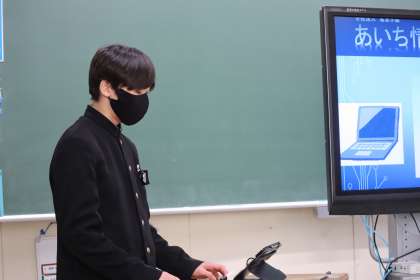 2年生が総合的な学習の時間をはじめ、様々時間を見つけて制作に取り組んできた各自が選択した上級学校を紹介するためのプレゼン資料。1年生がその映像や先輩の説明を熱心に聞いています。