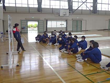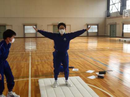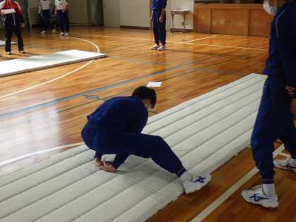 準備運動として、男女ともにネックスプリング(首跳ね起き)に挑戦していました。繰り返しの練習で突然できるようになった生徒もいました。