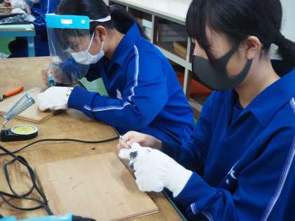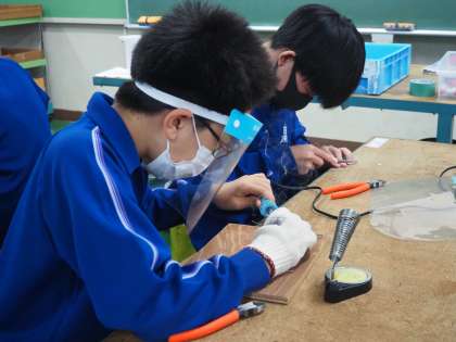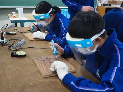 はんだごての使い方をマスターするために、簡単な作品づくりに取り組んでいます。どの生徒からも真剣に取り組んでいる様子が伝わってきます。