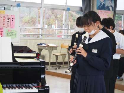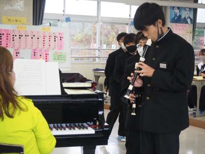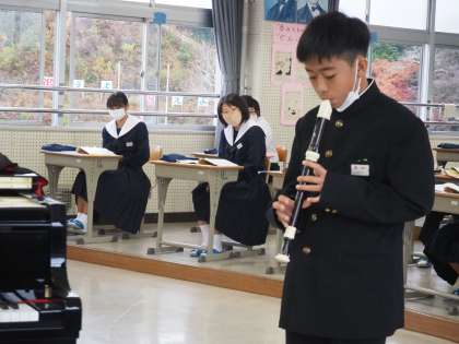 リコーダーのテストの臨んでいます。緊張しながらも、今の実力を発揮しようと頑張っていました。