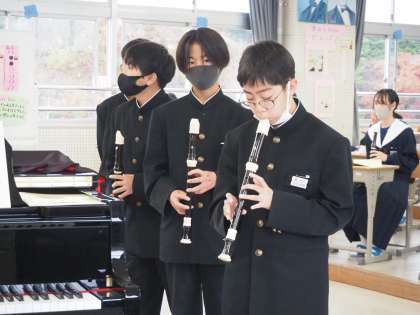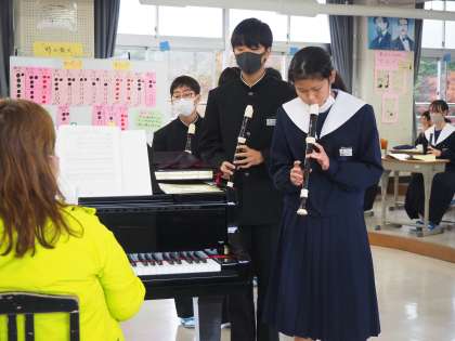 リコーダーのテストの臨んでいます。緊張しながらも、今の実力を発揮しようと頑張っていました。