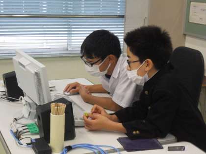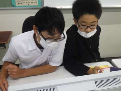 3年生が他の授業に行っていたため、2年生のみでの授業です。自然教室の活動で使用する写真のデータを選別していました。仲間の楽しそうな雰囲気の写真を探しながら、自分たちもこれまでの活動を懐かしんでいました。