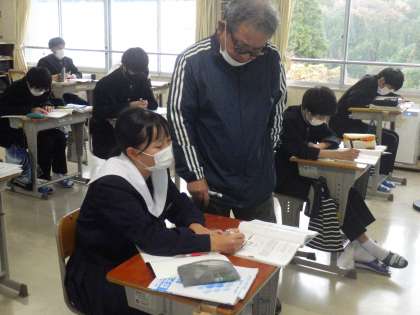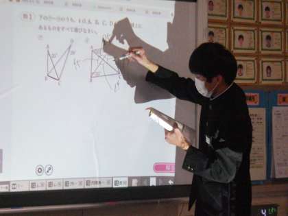 円周角の問題に取り組んでいました。覚えるべき基本的なことは多くはありませんが、問題のパターンは無限。いかに早く正確に答えを導き出すかを仲間と相談し合っています。これからは“ひらめき”も重要になってきます。