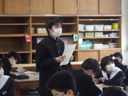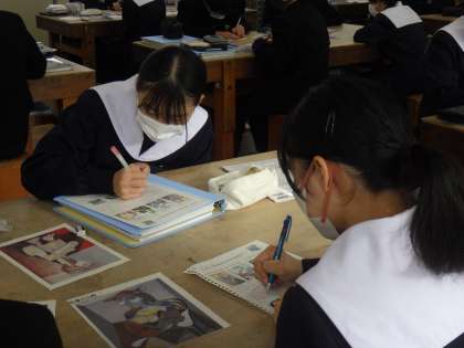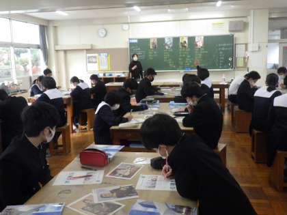 鑑賞の授業で、「ピカソの作品の良さに迫る」をテーマに学習が進められていました。今回は、ピカソの作品の中でも「女性」をモデルにした作品に絞り、それぞれの作品の印象からピカソの心情に迫っていきます。たくさんの意見が出され、生徒の意欲の高さに教科担任も感心するほどでした。