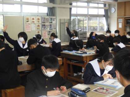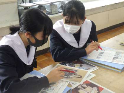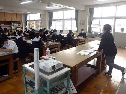 鑑賞の授業で、「ピカソの作品の良さに迫る」をテーマに学習が進められていました。今回は、ピカソの作品の中でも「女性」をモデルにした作品に絞り、それぞれの作品の印象からピカソの心情に迫っていきます。たくさんの意見が出され、生徒の意欲の高さに教科担任も感心するほどでした。