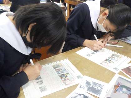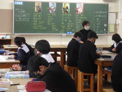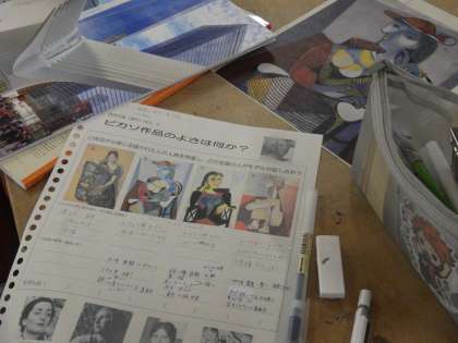 鑑賞の授業で、「ピカソの作品の良さに迫る」をテーマに学習が進められていました。今回は、ピカソの作品の中でも「女性」をモデルにした作品に絞り、それぞれの作品の印象からピカソの心情に迫っていきます。たくさんの意見が出され、生徒の意欲の高さに教科担任も感心するほどでした。