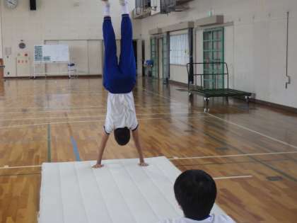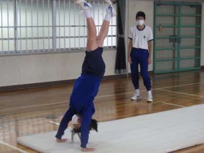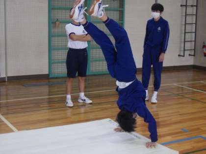 今日はいよいよ集団演技の発表の日です。本番直前の最後の確認をしていました。多少不安の残る大技の確認を熱心に行っていました。