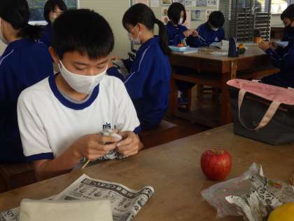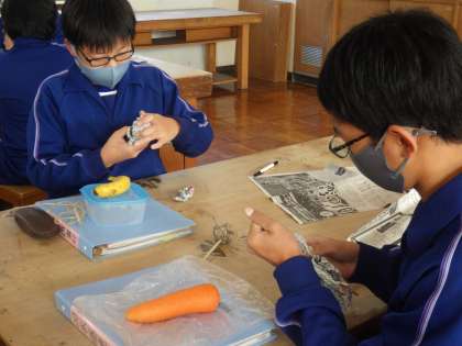 粘土での作品づくりに入っていました。持ち寄った秋の野菜や果物を本物そっくりに作っていきます。今日は、その下準備の工程です。出来栄えを想像して、準備にもしっかり取り組んでいました。