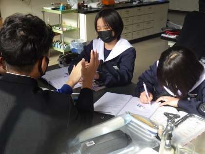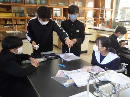 ストローを使った静電気の実験です。静電気をためるため、必死にストローをこすっていきます。同じ方法でもストロー同士が引っ付くパターンと離れていくパターンの2通りの結果に分かれていました。ある生徒がつぶやいた「どうして?」の解明に、必死の取り組んでいました。