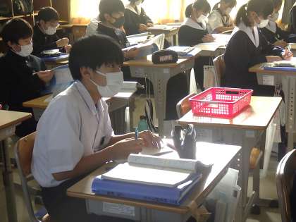 アフリカの産業の特色について学んでいました。大量に書かれる黒板の言葉を必死になってノートやプリントに書き写していきます。忙しい分、集中力も持続しているようです。