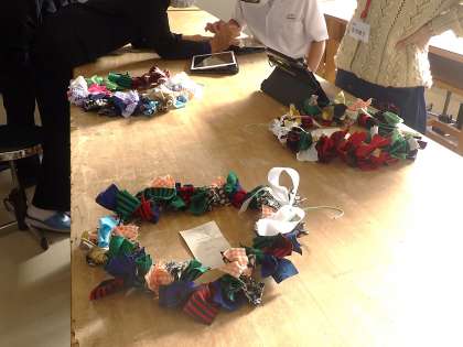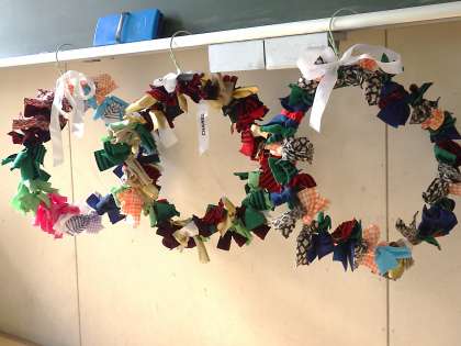 環境にやさしいクリスマスリースづくりです。作品がいよいよ完成し、タブレットに写真で納め、お互いの作品を鑑賞しています。作品の見所や頑張った部分なども紹介し合い、それぞれの頑張りをたたえ合っていました。