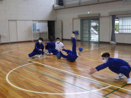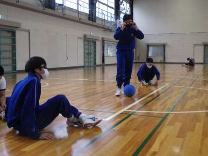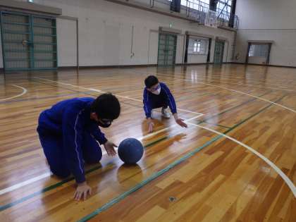 マット運動の集団演技発表会を終え、ゴールボールの単元に入っていました。ボール内の鈴に音だけを頼りに、ボールを投げたり止めたりして得点を競うスポーツです。