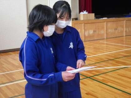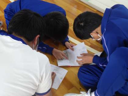 最後の時間に発表する連続技の練習が行われていました。まだまだ成功率が低い技を中心に、繰り返し練習していました。男女問わず大技にも挑戦している生徒が多く、練習中はお互いにアドバイスをし合ったり、補助で助けたりしていました。