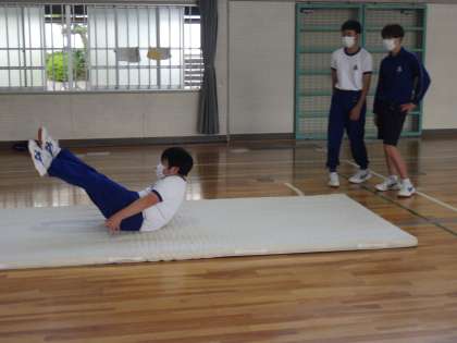 最後の時間に発表する連続技の練習が行われていました。まだまだ成功率が低い技を中心に、繰り返し練習していました。男女問わず大技にも挑戦している生徒が多く、練習中はお互いにアドバイスをし合ったり、補助で助けたりしていました。