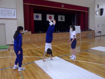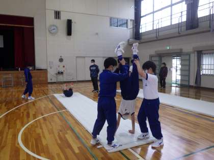 1年生は共通の課題として「倒立前転」があります。補助ありの倒立から前転するか、まったく補助なしで一連の流れを行うか、練習も仲間と息を合わせながら取り組んでいました。
