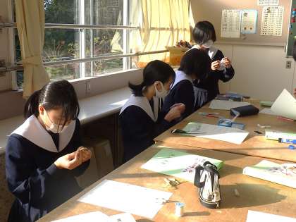 今日は被服室で裁縫の学習です。家庭で不要になっている物を活用し、「ミニピンクッション」の製作に取り組んでいました。