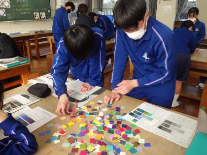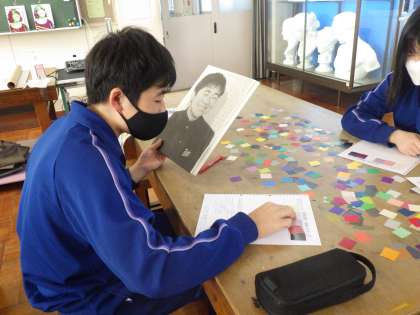 明暗分割の技法を使っての自画像のイラストづくりに取り組んでいました。今日はその中でも重要となる配色の決定でした。自分のイメージ、作品のイメージに合わせて使用する色を考えていきます。差し色にも気を遣い、仲間からのアドバイスをもらいながら活動を進めていました。