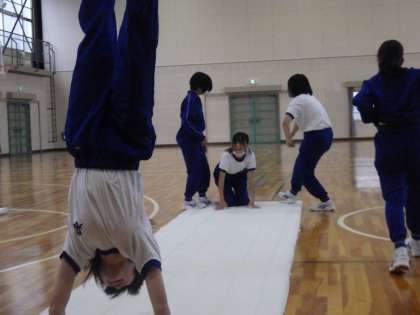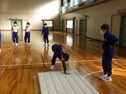 今日は、これまで練習を重ねてきた「倒立前転」の技のテストでした。緊張しながらも、練習の成果をしっかり発揮しようと真剣な表情でテストに臨んでいました。