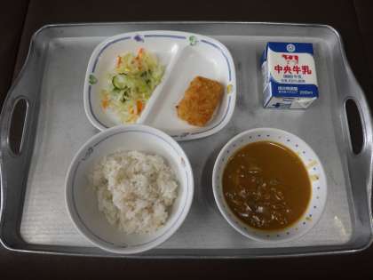 今日の献立は、カレーライス(麦ごはん)、サワーキャベツ、たらフライ、牛乳 でした。 エネルギー:899kcal