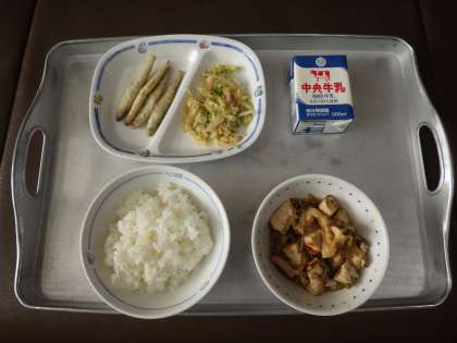 今日の献立は、ひきずり、ごぼうサラダ、わかさぎのから揚げ、ごはん、牛乳 でした。 エネルギー:808kcal